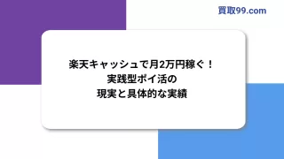 ポイ活 楽天キャッシュで月2万円稼ぐ!実践型ポイ活の現実と具体的な実績 ポイ活の現実:理想と実績のギャップを埋めるインターネットを検索すると、楽天キャッシュを使ったポイ活で「月10万円稼いだ」「還元率4.5%を実現した」といった、華々しい成功事例が数多く掲載されています。これらの情報を読むと、誰もが簡単に大きな... ポイ活楽天キャッシュ
